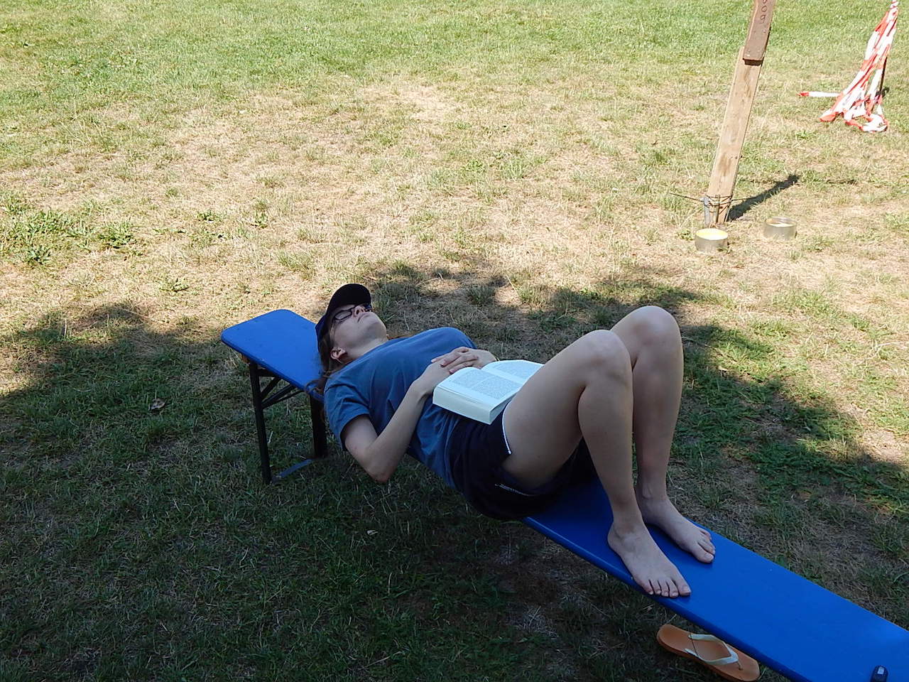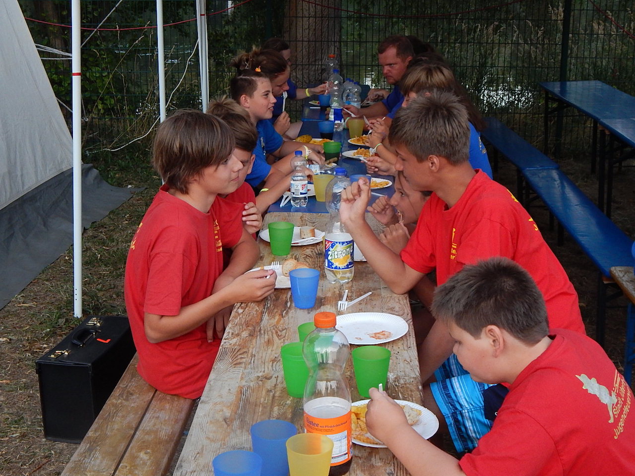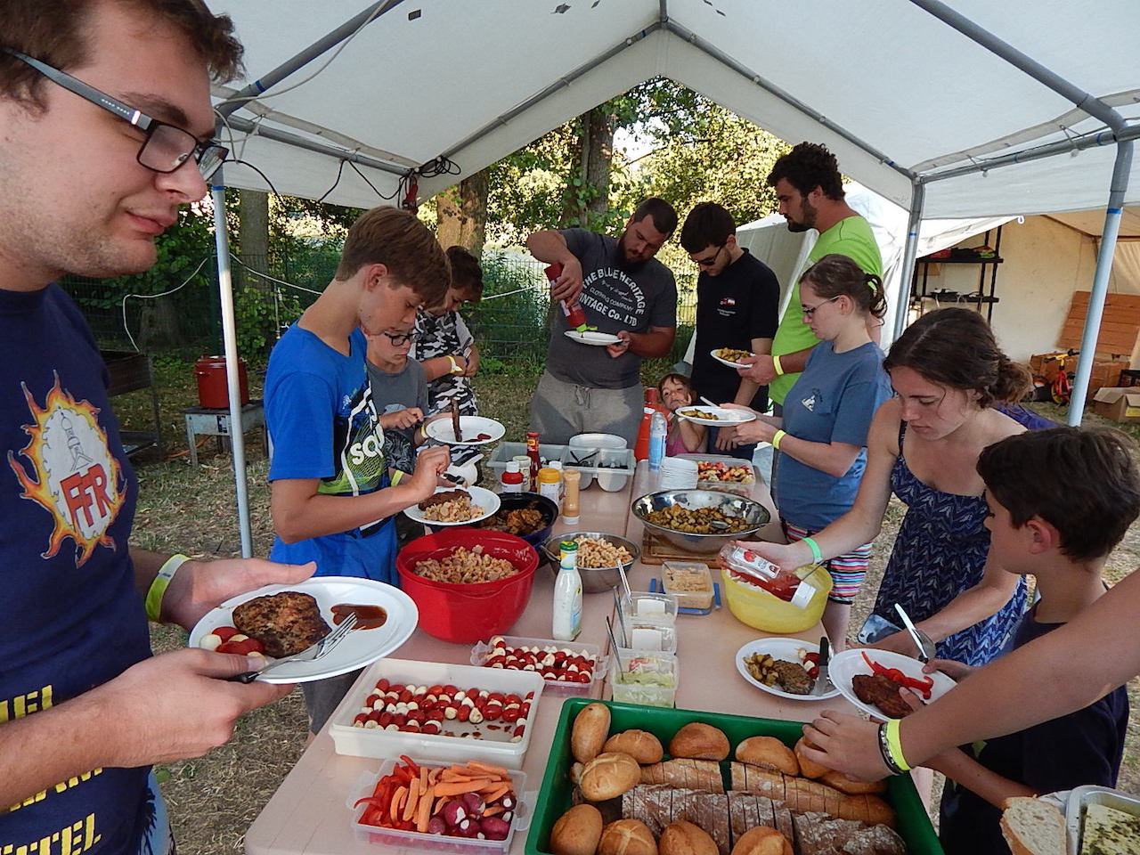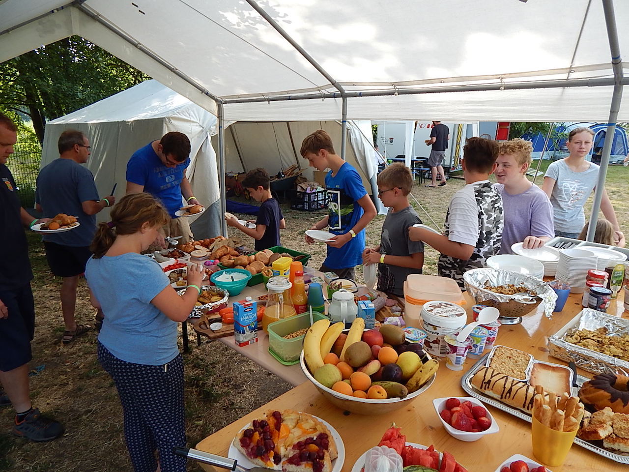 Pünktlich um 7.00 Uhr läutet die Frühstücksglocke, alle stürzen aus den Zelten. Naja, vielleicht nicht „stürzen“, sondern eher „krabbeln“. Aber wie auch immer – kurz darauf sitzen alle am gedeckten Tisch und lassen sich das zeltlagertypische Frühstück schmecken.