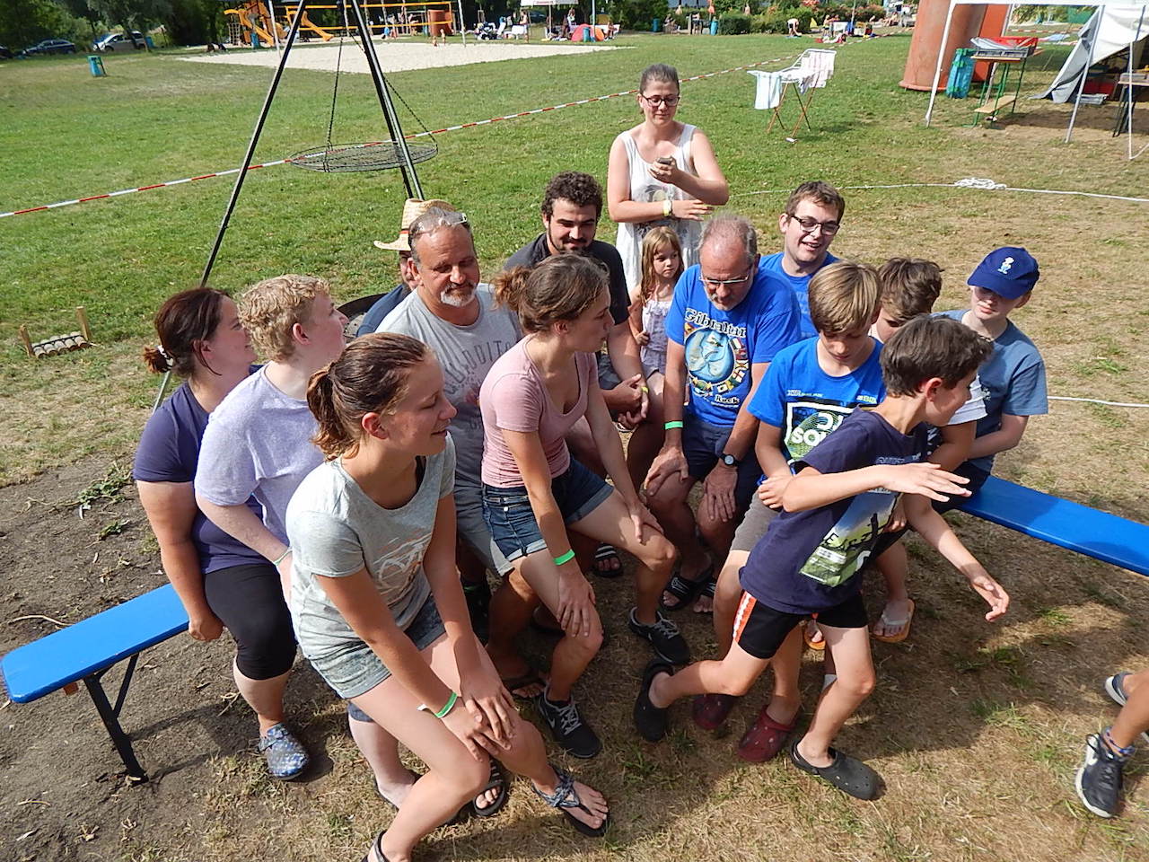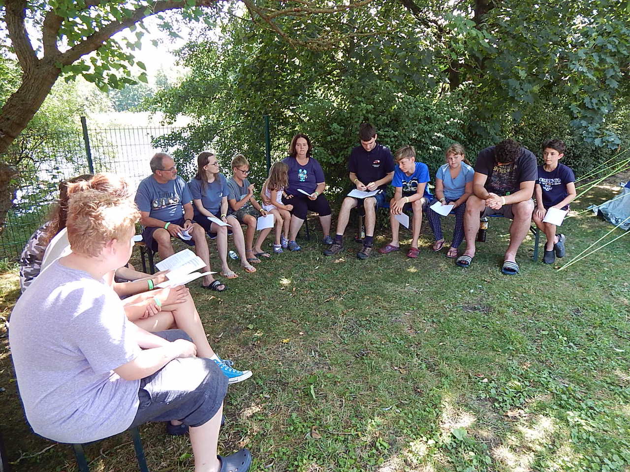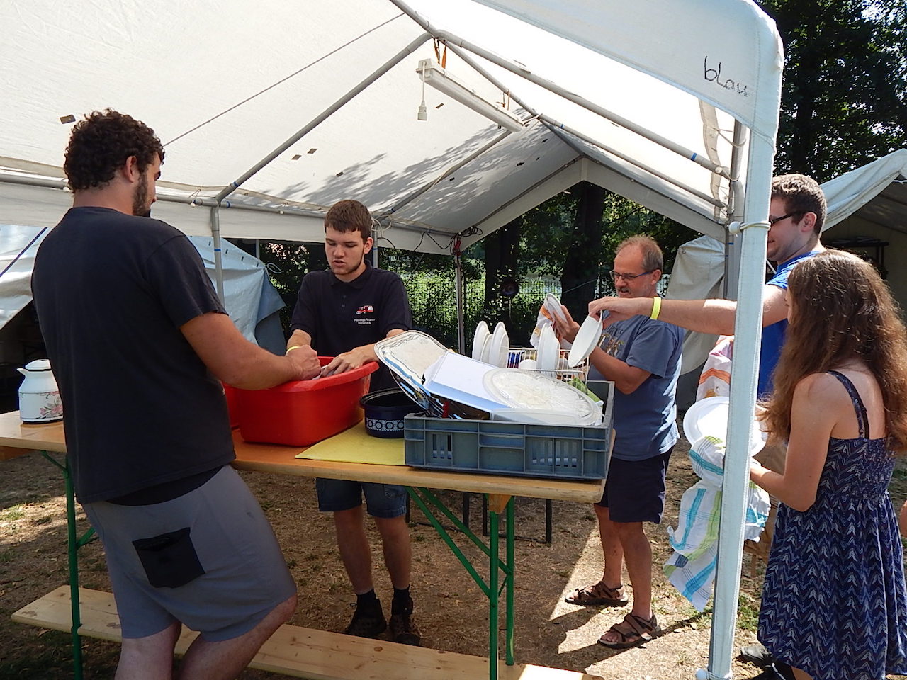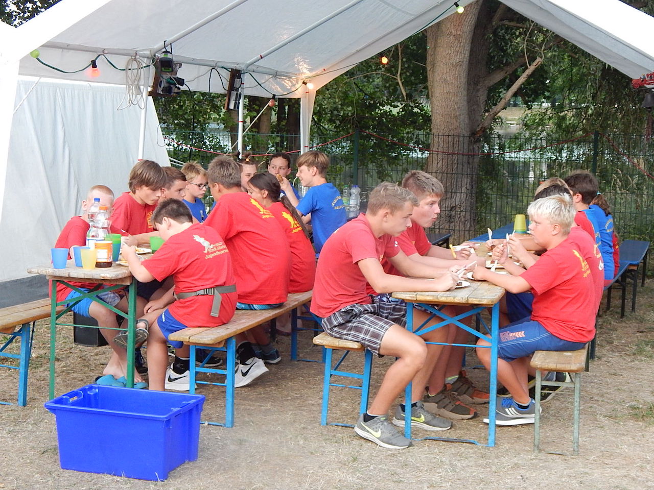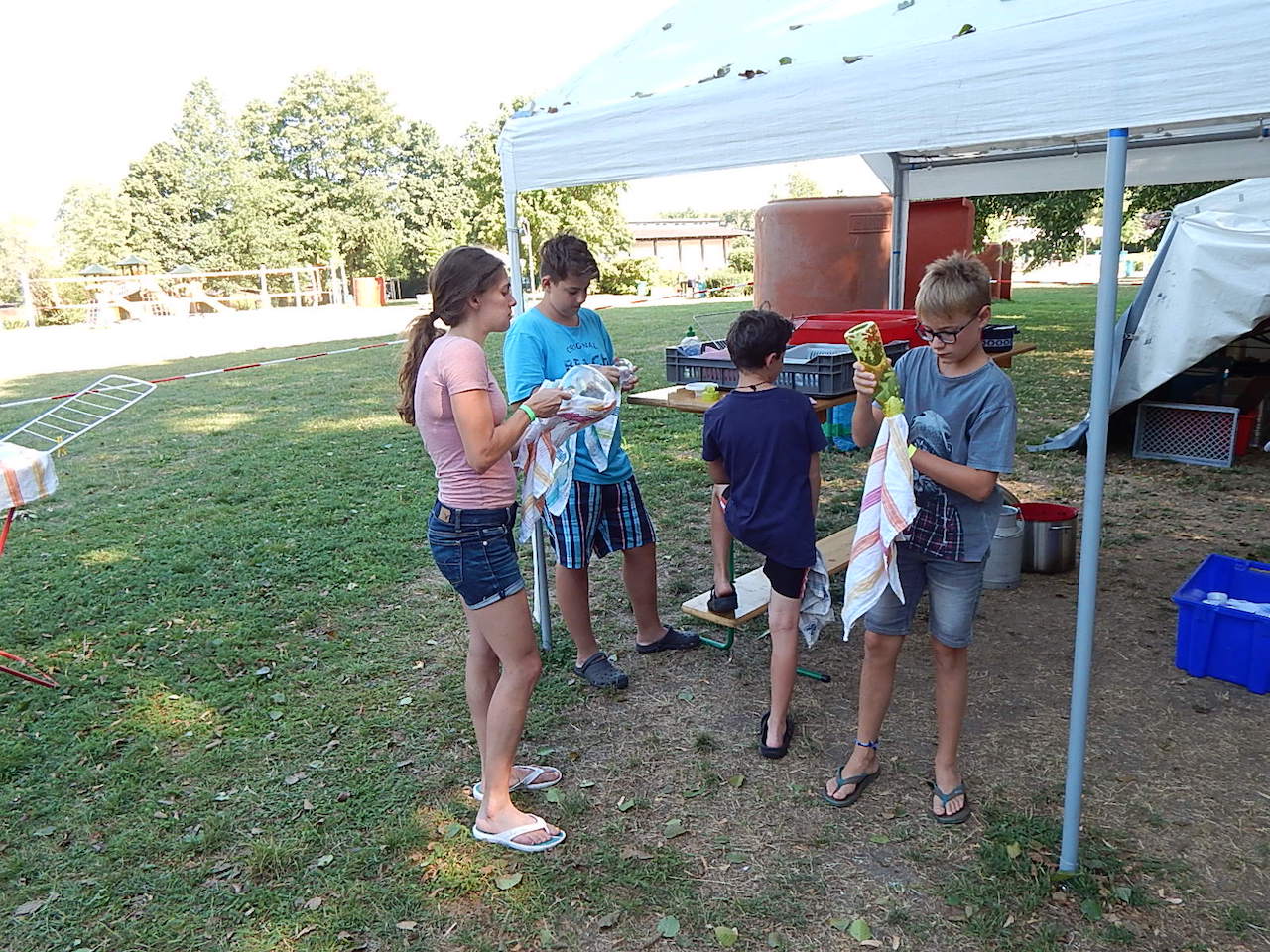 Pünktlich um 7.00 Uhr läutet die Frühstücksglocke, alle stürzen aus den Zelten. Naja, vielleicht nicht „stürzen“, sondern eher „krabbeln“. Aber wie auch immer – kurz darauf sitzen alle am gedeckten Tisch und lassen sich das zeltlagertypische Frühstück schmecken.