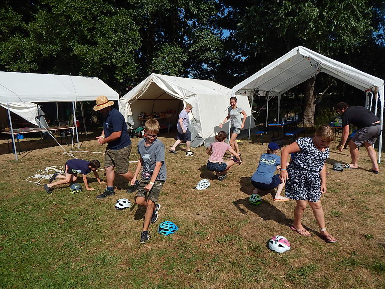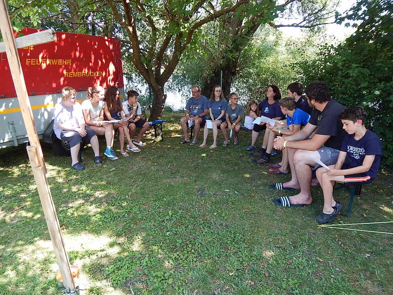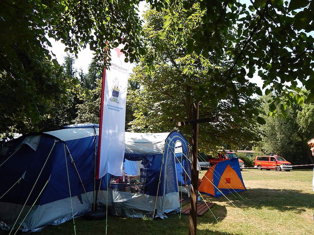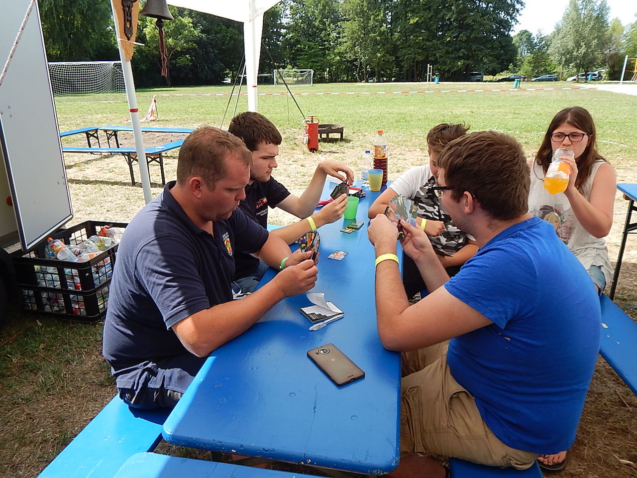 Pünktlich um 7.00 Uhr läutet die Frühstücksglocke, alle stürzen aus den Zelten. Naja, vielleicht nicht „stürzen“, sondern eher „krabbeln“. Aber wie auch immer – kurz darauf sitzen alle am gedeckten Tisch und lassen sich das zeltlagertypische Frühstück schmecken.