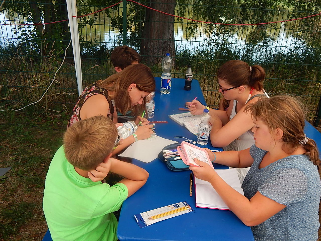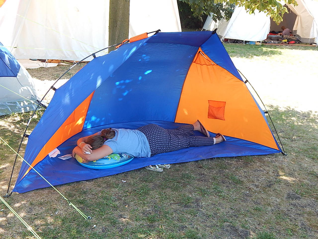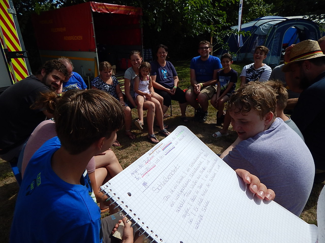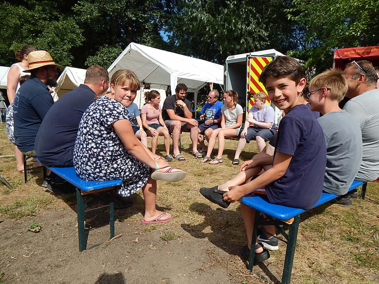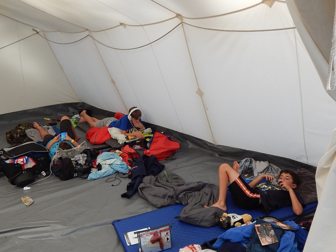 Pünktlich um 7.00 Uhr läutet die Frühstücksglocke, alle stürzen aus den Zelten. Naja, vielleicht nicht „stürzen“, sondern eher „krabbeln“. Aber wie auch immer – kurz darauf sitzen alle am gedeckten Tisch und lassen sich das zeltlagertypische Frühstück schmecken.