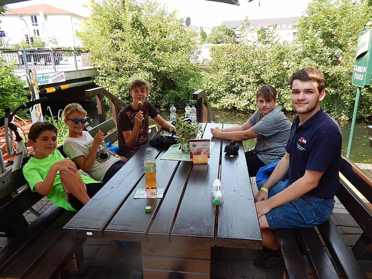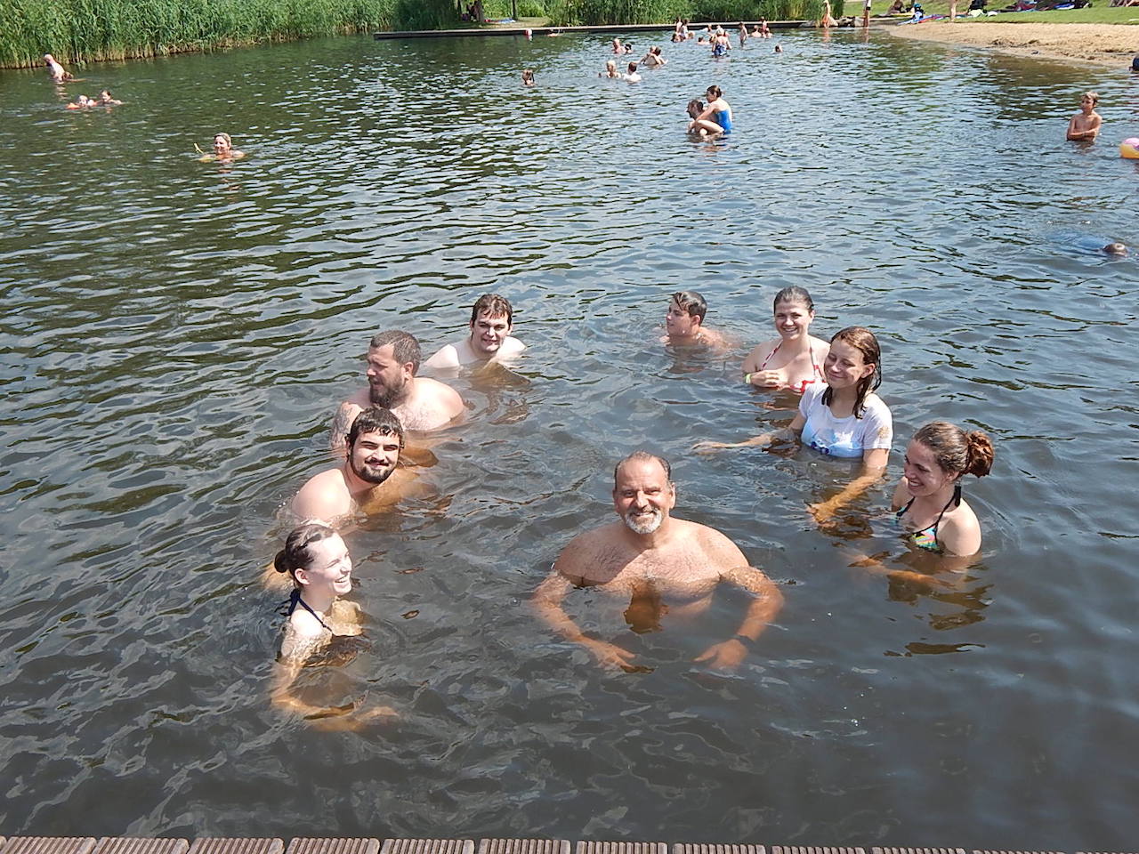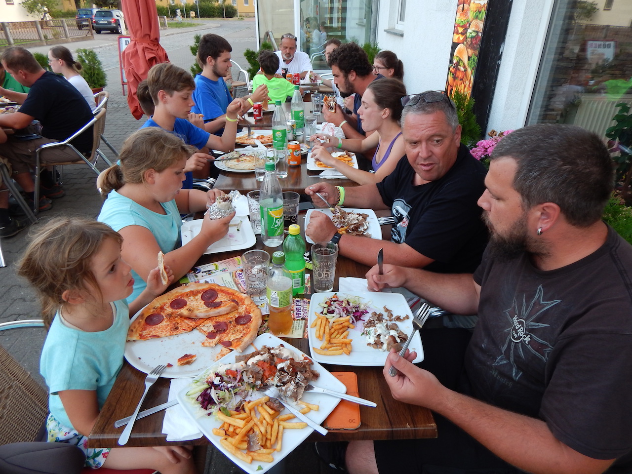 Am Alexanderplatz treffen wir dann auf die anderen Gruppen – und machen uns auf den Weg zurück nach Jüterbog. Auch heute ist unser Zug pünktlich und so sind wir um 19.30 Uhr zurück. Allerdings fehlt noch das Abendbrot. Und das gibt es heute bei Ali – oder genauer im „Grillhaus Ali Baba“, einem der beiden örtlichen Döner-Dealer. Hier werden mal locker zwanzig Pizza, Döner, Dürüm und Döner-Teller mit und ohne Extra-Fleisch und/oder –Käse verdrückt bevor es zurück zum Freibad geht.